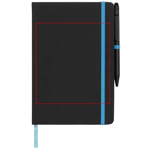 Modernes und elegantes schwarzes Notizbuch mit Einband mit weicher Haptik. Wird mit farbigem Rand und Seitenmarkierung in passender Farbe, Stiftschlaufe und Verschlussriemen geliefert. Wird mit einem einfarbig schwarzen Stylus-Kugelschreiber geliefert. Mit 96 Blatt (70 g/m²) cremefarbigem liniertem Papier.
