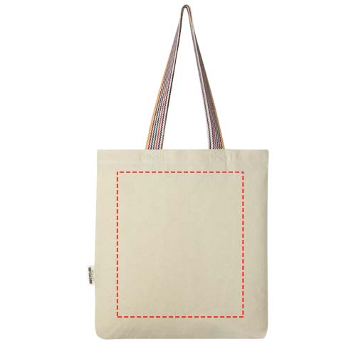 Die Rainbow Tragetasche mit 180 g/m² ist ein echtes Upgrade zur normalen Baumwolltragetasche. Diese Einkaufstasche aus Recyclingbaumwolle und -polyester ist hergestellt aus Produktionsresten und hat 25 cm lange Tragegriffe aus regenbogenfarbenem Gurtband und eine 3,5 cm breite Standfläche. Sie bietet somit mehr Stauraum. Belastbar bis zu 5 kg.