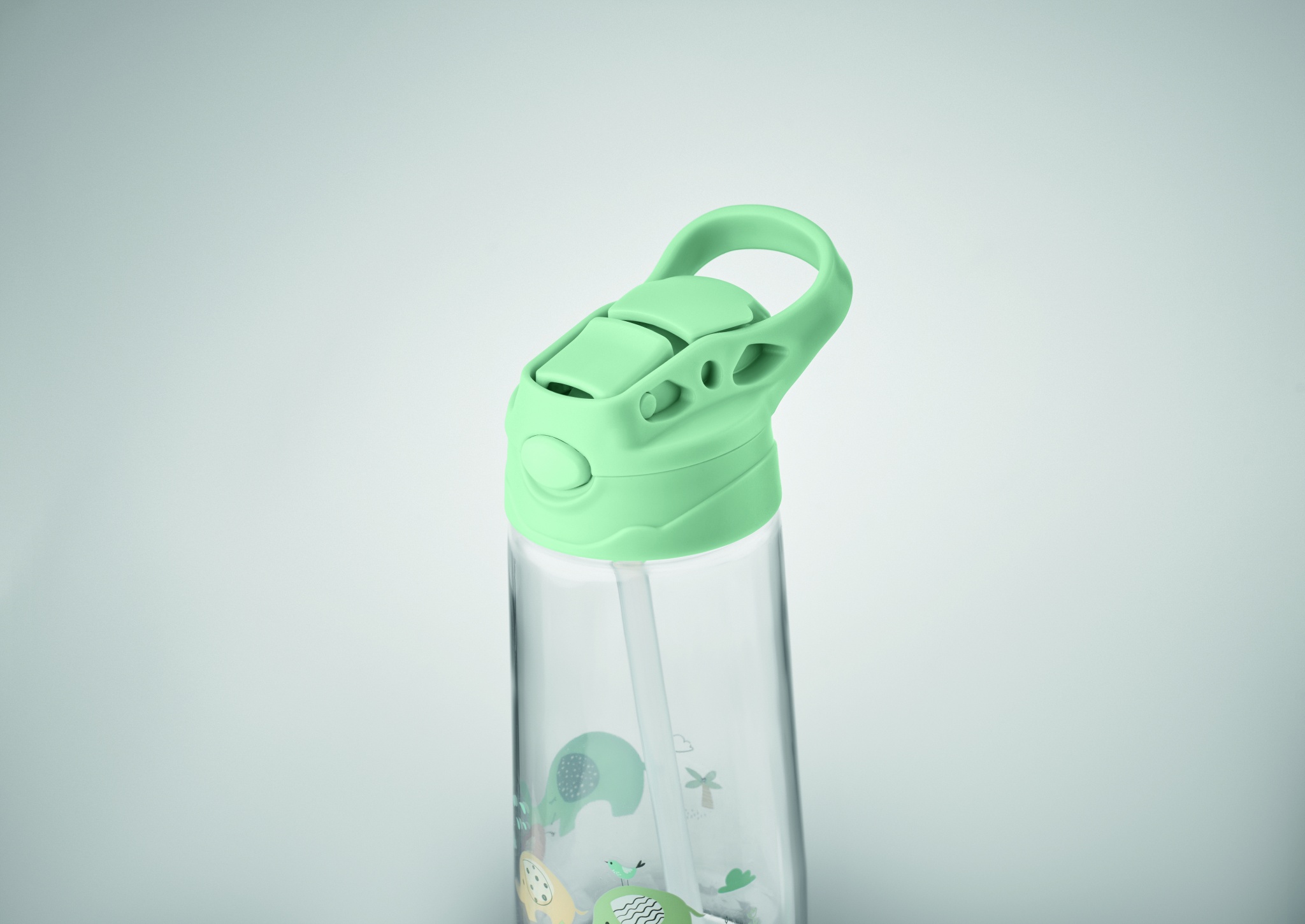 Trinkflasche für Kinder aus Tritan. Deckel mit integriertem Trinkhalm. Auslaufsicher. Füllmenge: 450 ml.