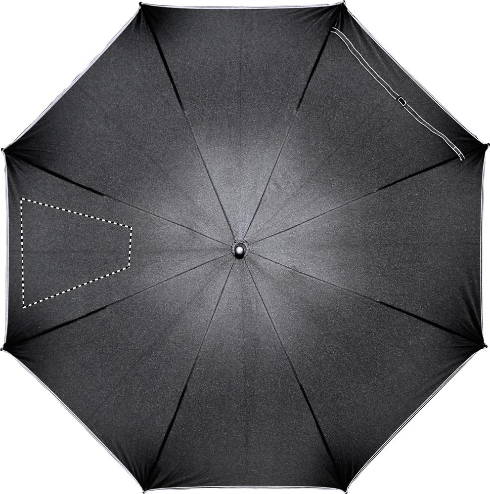 23 inch auto open windproof umbrella in 190T pongee with fiberglass shaft and ribs in colour with black plastic tips. Panels in black with matching colour stitching. Straight black plastic handle. Manual closure.