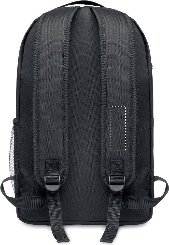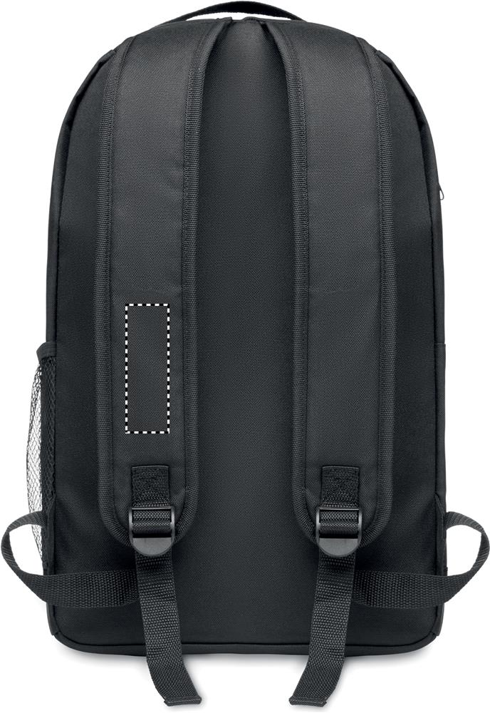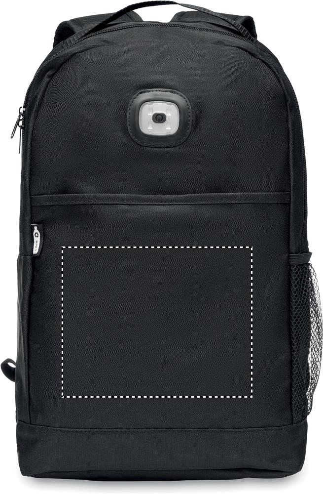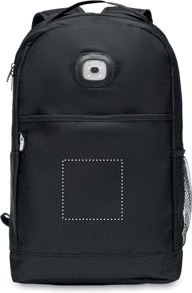 Backpack in 600D RPET with detachable COB light on the front panel. COB light in white colour with 3 different light brightness setting. Front pocket with hook and loop closure. Mesh pocket on the side. Button cell battery included.