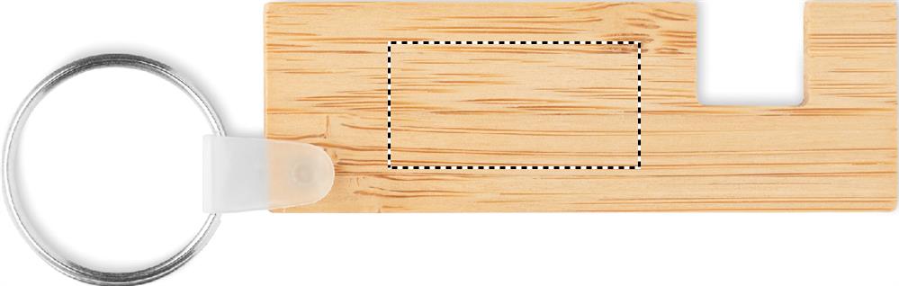 Bamboo key ring with phone stand functionality. Bamboo is a natural product, there may be slight variations in colour and size per item, which can affect the final decoration outcome.