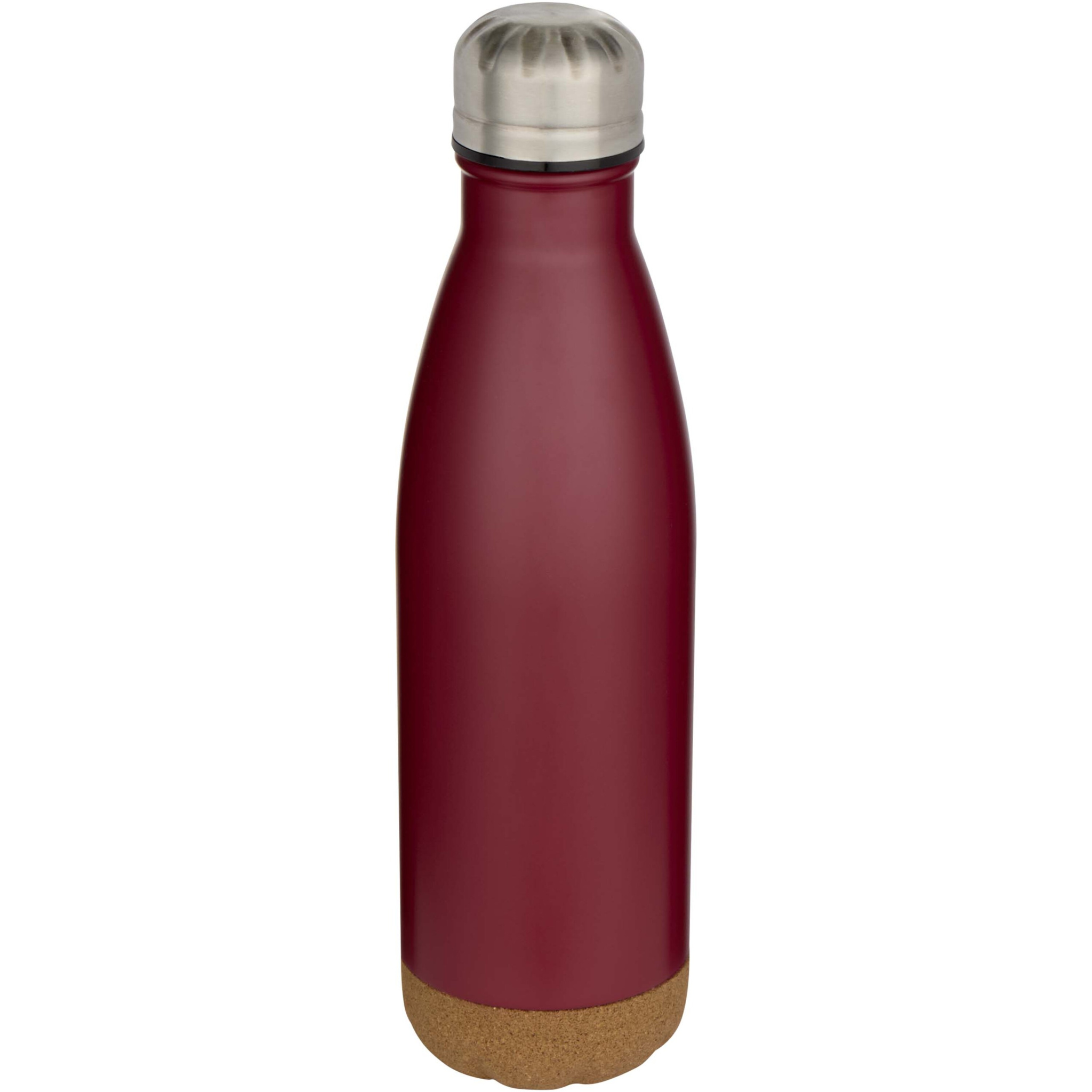 Vacuum insulated stainless steel water bottle with cork details at the bottom. The double-wall insulation keeps drinks hot or cold for several hours. Presented in a recycled cardboard gift box. Volume capacity: 500 ml.
