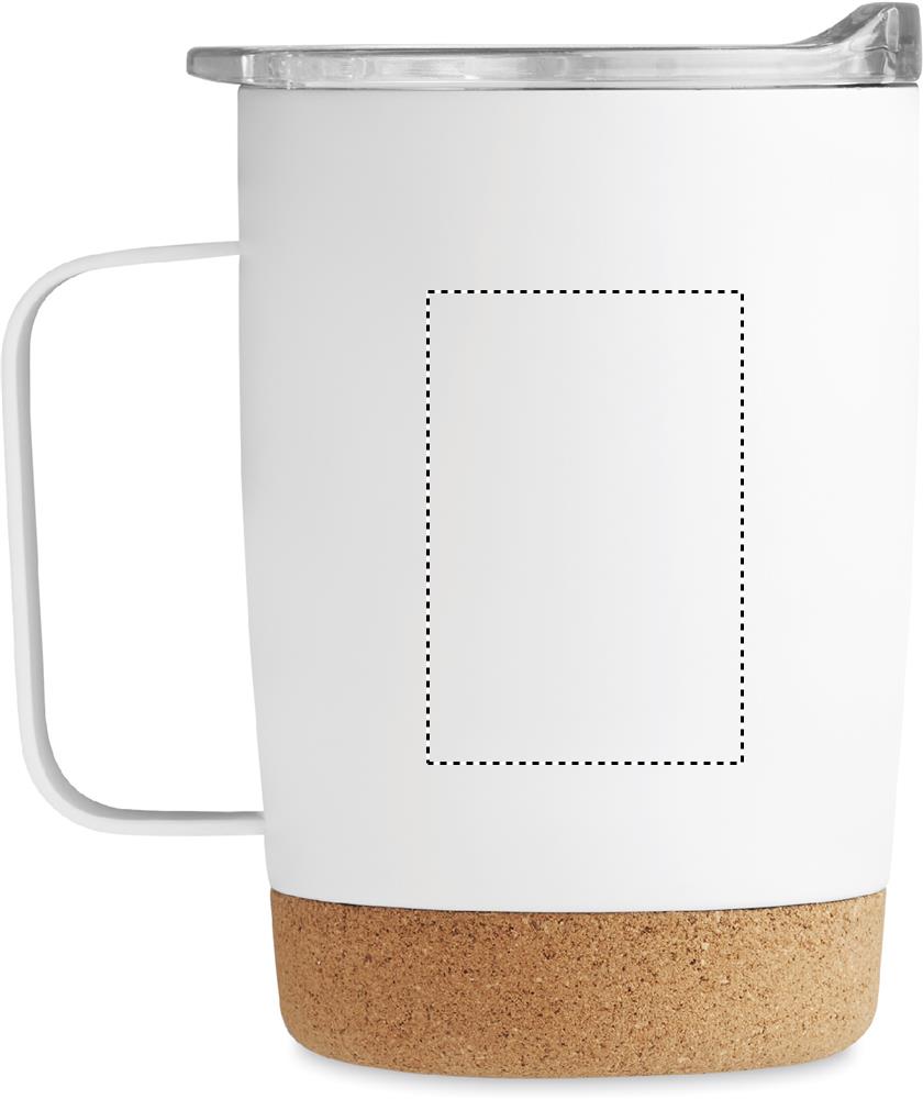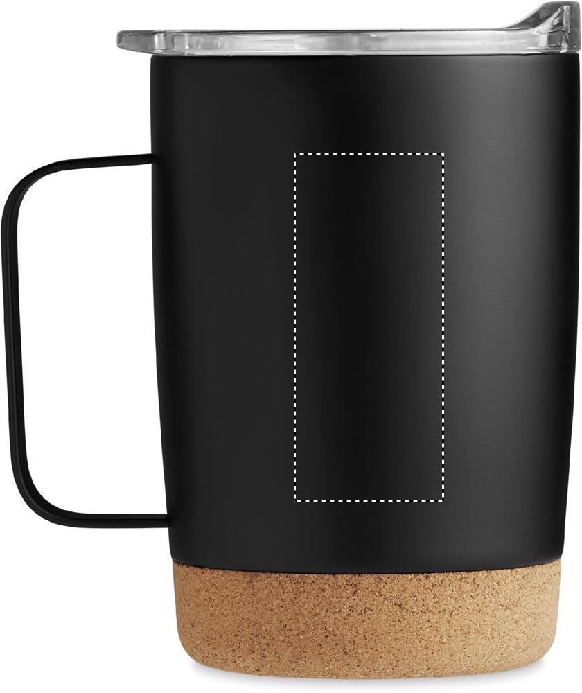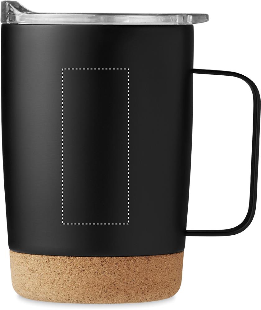 Double wall stainless steel mug with cork base and sliding sip hole cover. Capacity: 300 ml. Cork is 100% natural material. Due to its structural nature and surface porosity the final print result per item may have deviations.
