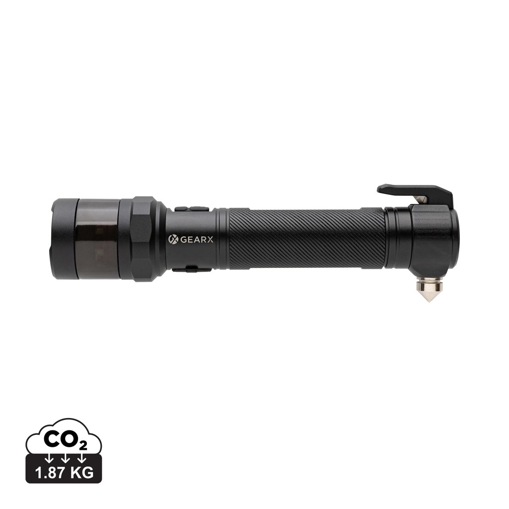 Heavy-duty car safety tool made with RCS certified recycled Aluminum and ABS. Total recycled content: 59% based total item weight. RCS certification ensures a completely certified supply chain of the recycled materials. The torch uses a re-chargeable A-grade 2000 mah lithium battery so no need to replace the batteries. Simply re-charge via your USB socket. With powerful 500 lumen torch with beam up to 100 metres. The led light has 4 modes (100%,50%, 30% and flashing) With red emergency LED that can operate in 3 modes ( quick flash, slow flash and SOS). With integrated belt cutter and window hammer. With magnet to attach it to a magnetic surface. Operating time on one charge: 2 hours. IPX 4 waterproof.
