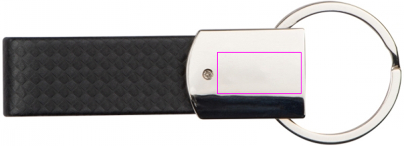 Elegant metal key ring with carbon-look strap. Your logo will be engraved on the chromed surface.