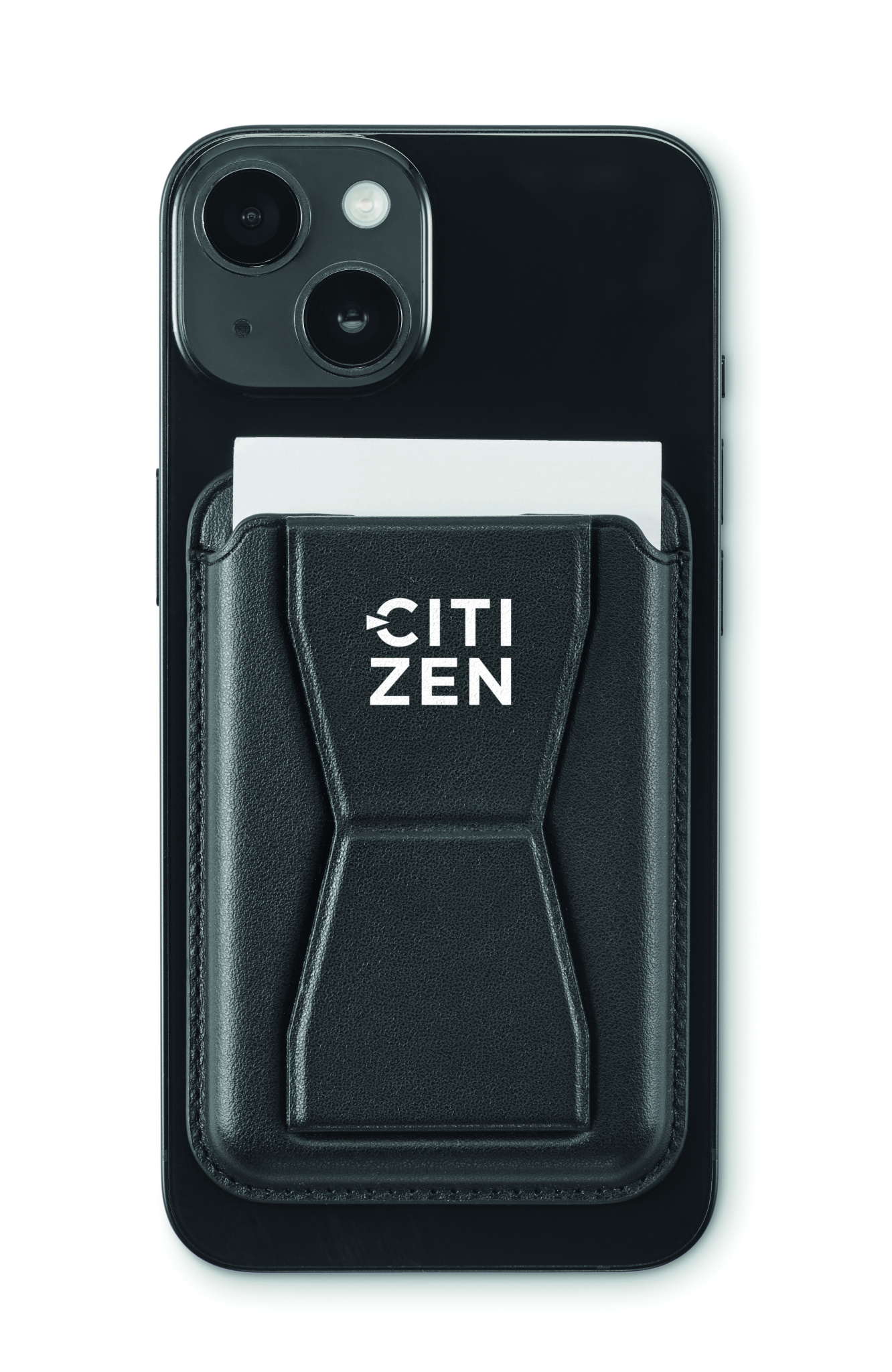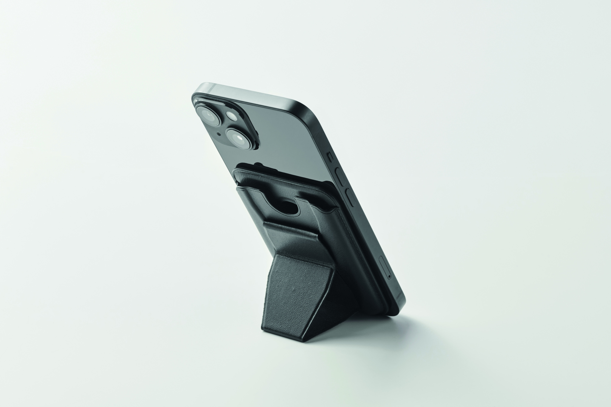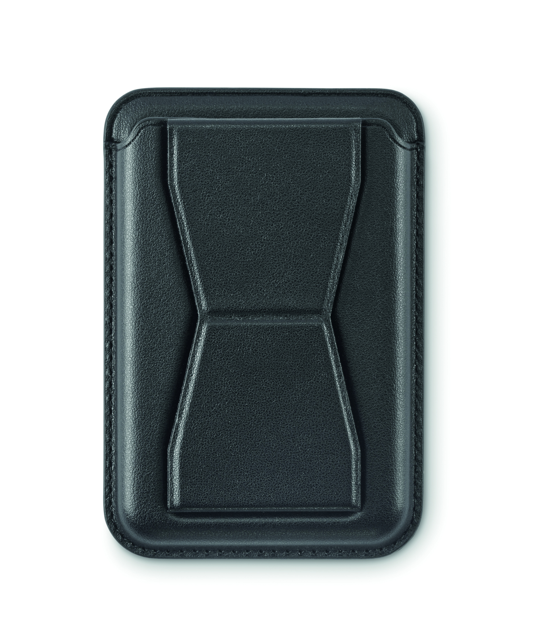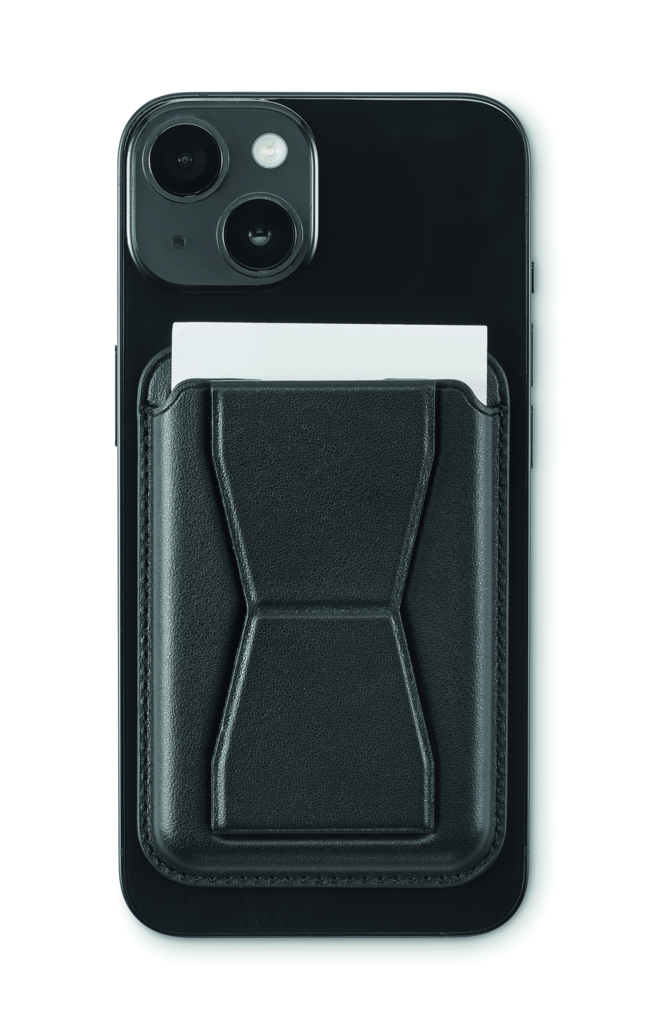 PU leather phone cardholder (for 2 cards) with stand function and magnetic closure. Compatible with iPhone® 12 and newer. Including magnetic metal ring to support charging of other non-magnetic wireless chargeable phones.