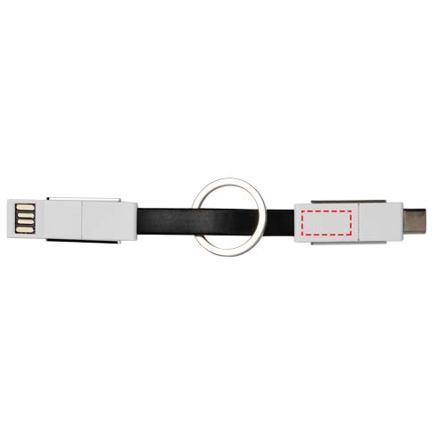 A 4-in-1 cable that covers all charging needs in one package. It features a USB type A, Type-C, and a 2-in-1 tip that is compatible with both iOS and Android devices. It can be used for charging and data transfer. Comes with a keychain and has magnets for convenient carrying.