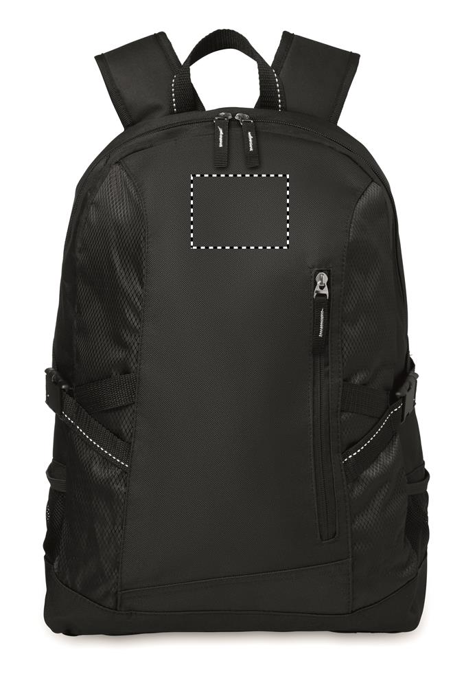 15 laptop backpack in 600D with rip stop details. Includes one internal 15 laptop compartment, one main front zippered pocket and 2 side compartments. Adjustable shoulder strap.