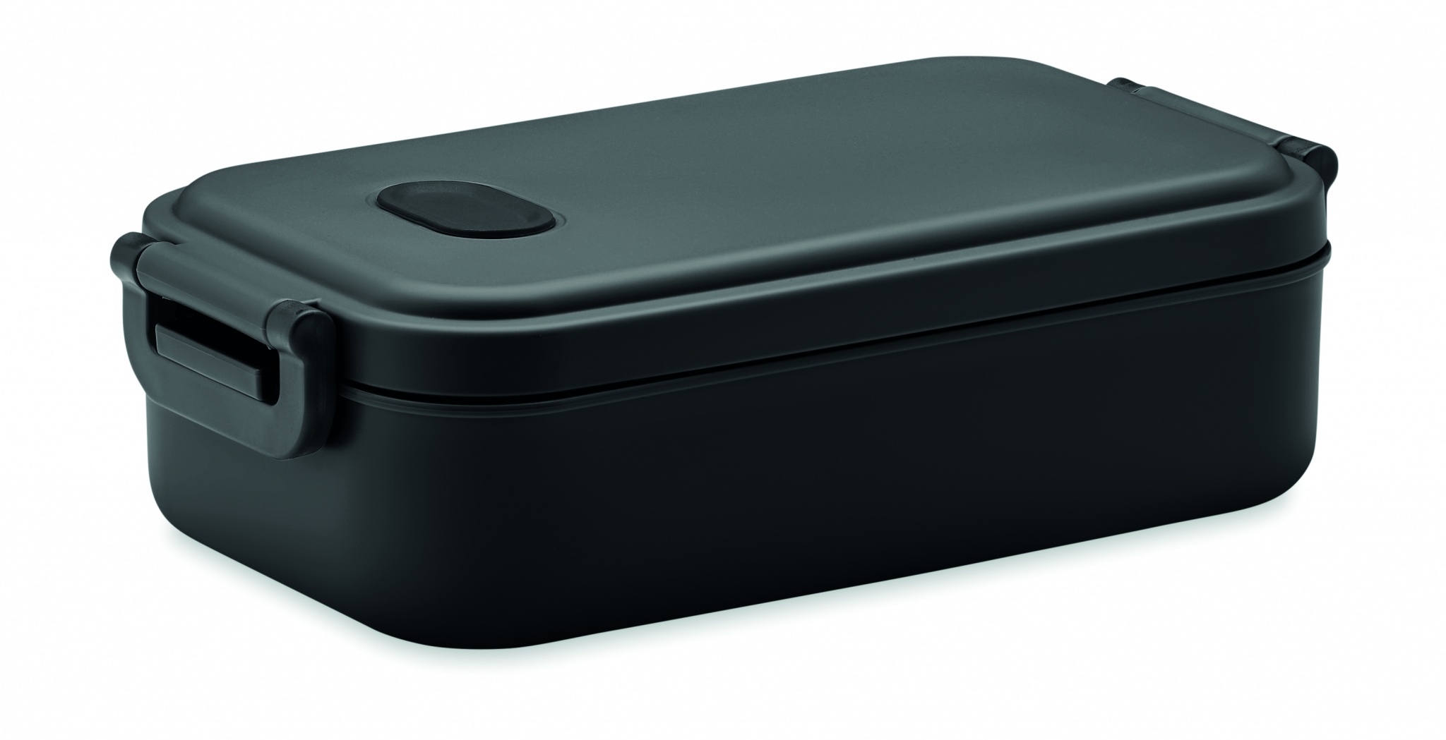 Recycled PP lunch box with airtight lid, silicone valve and two side buckles. Capacity: 800 ml.