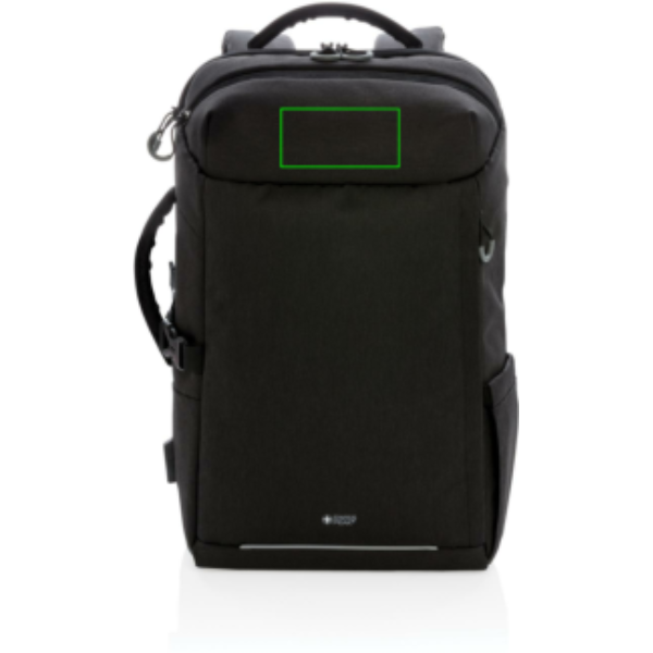 This carry-on travel backpack is intended for overnight or weekend trips. It is designed with a padded 17" laptop compartment to protect your device. This style has the capacity of a trolley without the weight of the wheels and handle, plus using a backpack makes you more mobile, hands-free and simplifies your travel experience. Leave your wheels at home and travel easily. Including trolley strap, water bottle side pocket and USB A output. Top quick access pocket, front zippered pocket and RFID protected pockets. With AWARE™ tracer that validates the genuine use of recycled materials. Each bag has reused 35.5 0.5L PET bottles. 2% of proceeds of each Impact product sold will be donated to Water.org. PVC free.