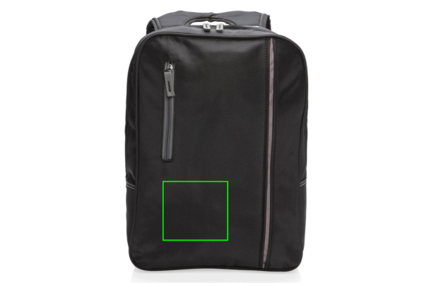 Padded microfibre and grey suedine detail, 2 compartments with padded folder suitable for 15,6” laptop, earphone exit, adjustable shoulder straps with phone pouch. Registered design®