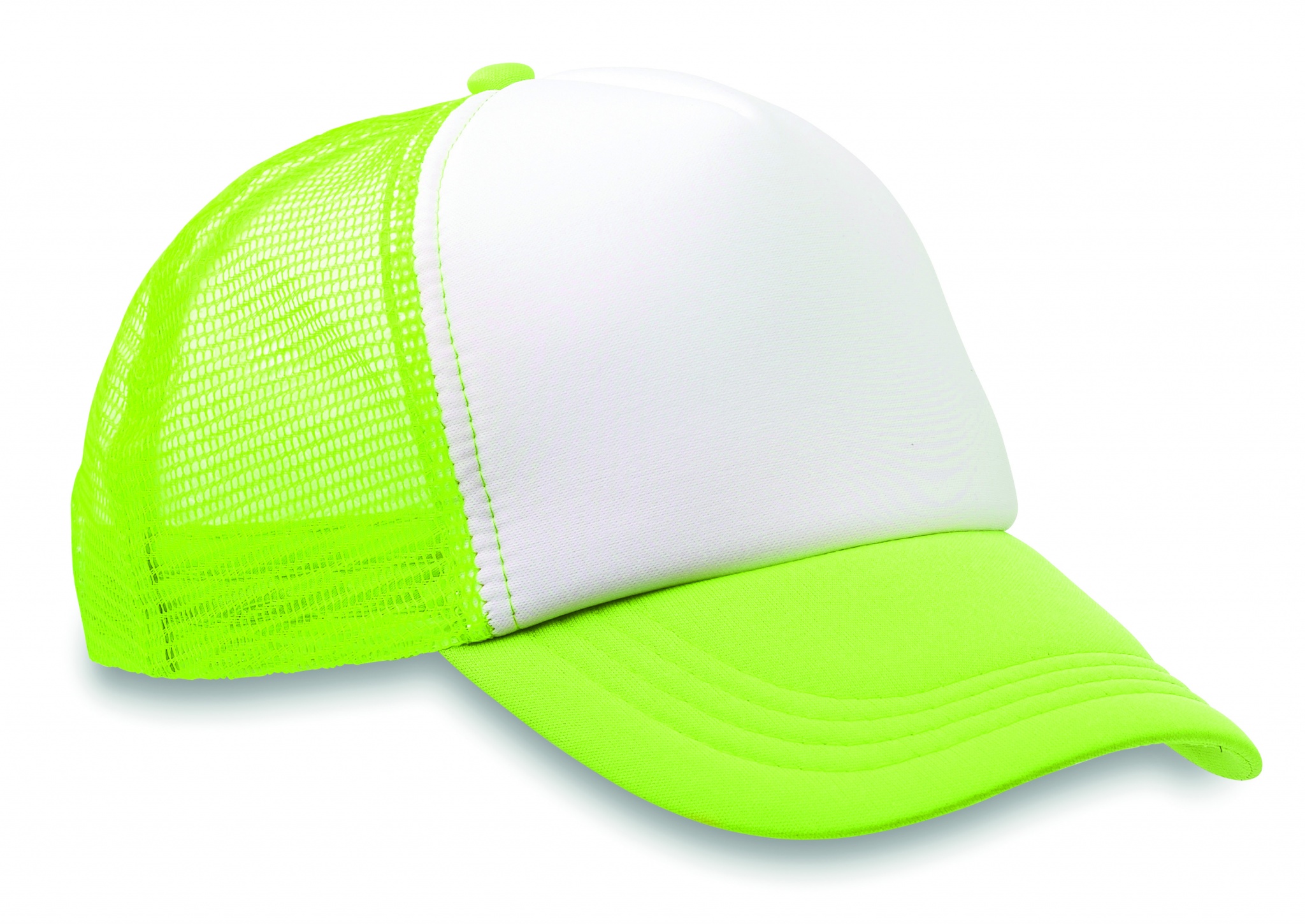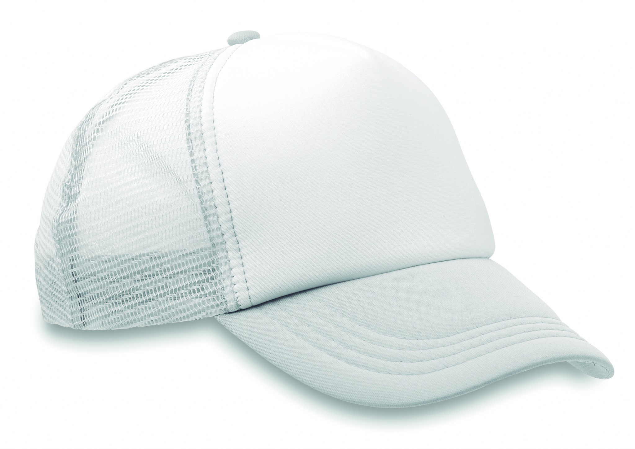 5 panel truckers cap in polyester 140-150 gr/m2 with adjustment plastic snap closure. White front panel and color visor in polyester jersey with foam backing. Other panels in color mesh. Size 7 1/4.