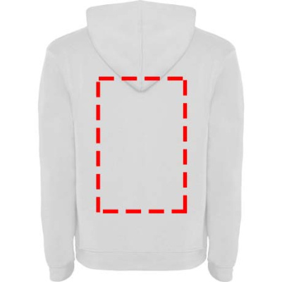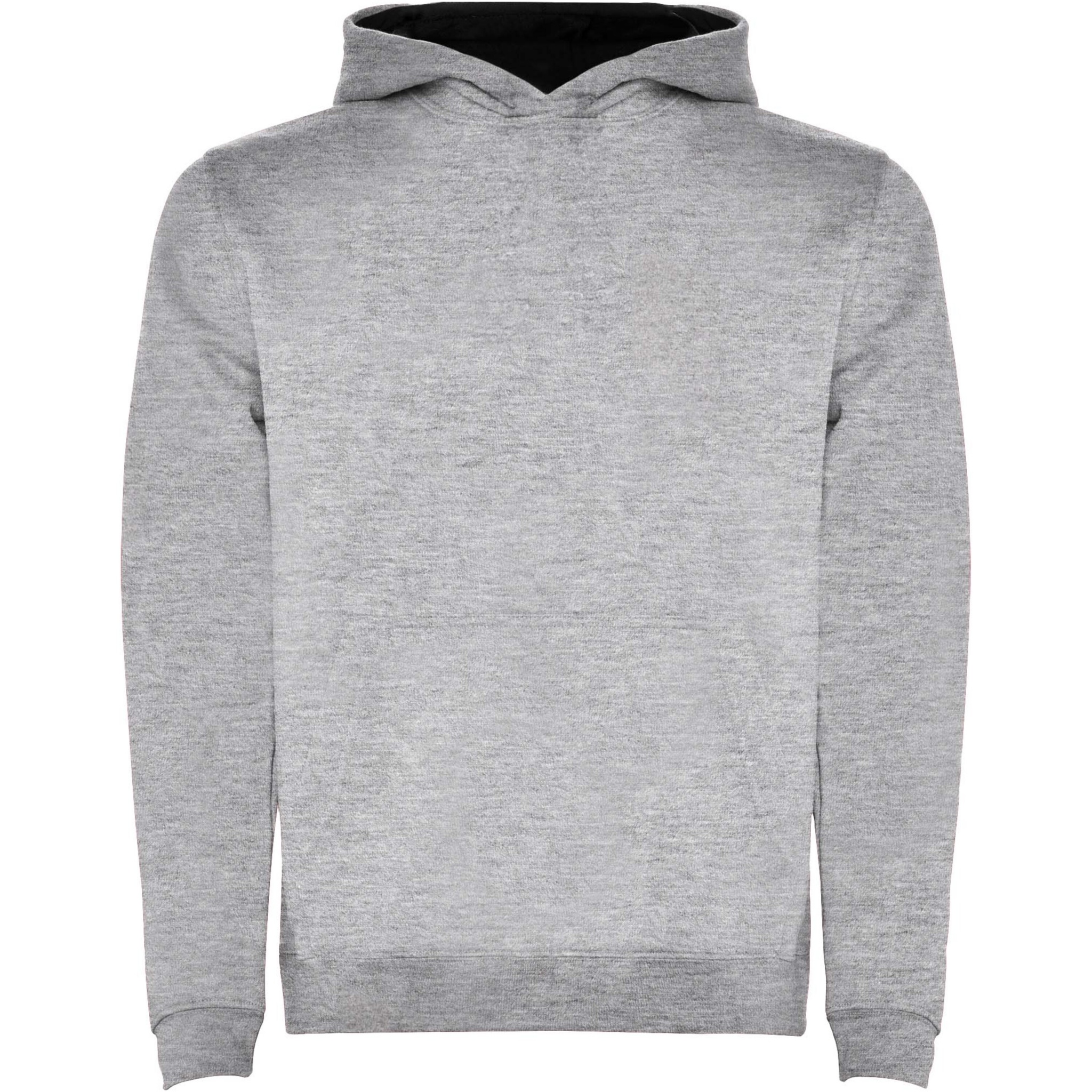 Two-colour hoodie with double fabric. Reinforced covered seams in collar and kangaroo style pocket. 1x1 elastane rib in cuffs and waistband. Removable label. The model is 120 cm and is wearing size 5/6.