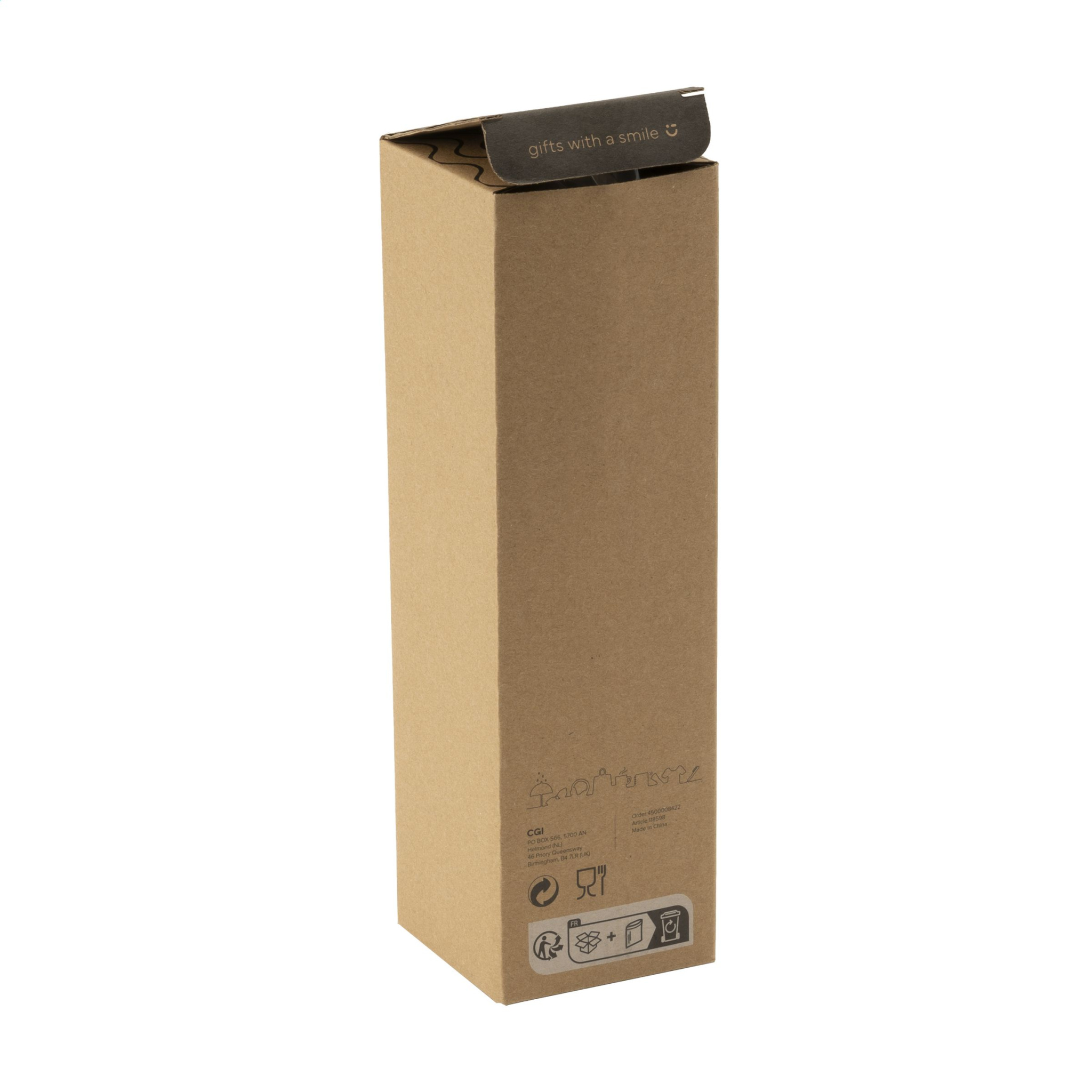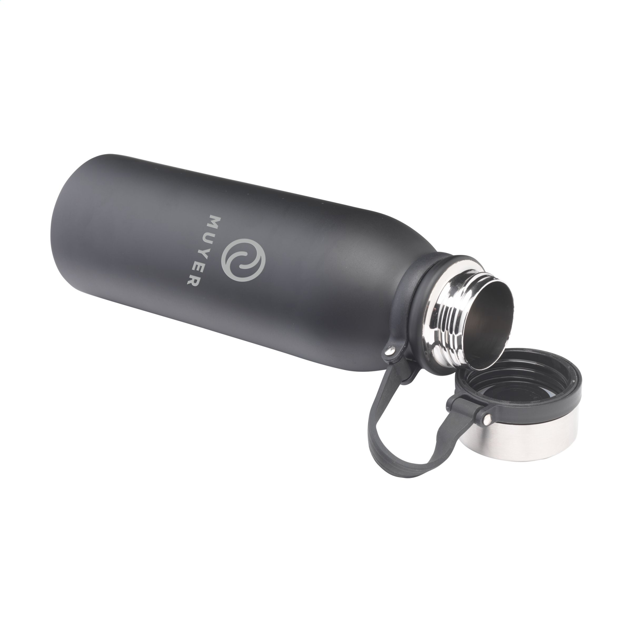 Double-walled, vacuum-insulated, leak proof stainless steel water bottle/thermo bottle. The screw cap is attached to a rotatable silicon carrying strap and remains attached when the bottle is open, so you always have one hand free. Suitable for maintaining the temperature of cold or hot drinks. Capacity 600 ml. Each item is individually boxed.