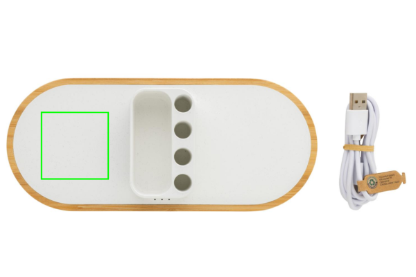 Kahekordne 10 W kiire juhtmevaba laadija koos pliiatsihoidjaga, mis on valmistatud RCS (Recycled Claim Standard) sertifitseeritud taaskasutatud ABS-ist. Taaskasutatud kogusisaldus: 31% eseme kogukaalust. RCS-sertifikaat tagab taaskasutatud materjalide täielikult sertifitseeritud tarneahela. Põhi on valmistatud FSC® 100% bambusest. Juhtmeta laadimine ühildub Androidi uusimate põlvkondade, iPhone 8 ja uuemate versioonidega. Saab laadida kahte telefoni korraga või laadida mis tahes muud juhtmevaba seadet. 4 pliiatsiauguga pliiatsite/pliiatsite hoidmiseks ja väikese hoiukohaga visiitkaartide või muude väikeste esemete hoidmiseks. Toode ja tarvikud PVC-vaba. Kaasa arvatud 120 cm C-tüüpi laadimiskaabel, mis on valmistatud RCS-sertifikaadiga taaskasutatud TPE-st. Pakitud FSC®mix kraftkarpi. Type-C in; Sisend 5V/2A; 9V/2A; Juhtmeta väljund 5V/1A;9V/1,1A; (10W) Registreeritud disain®