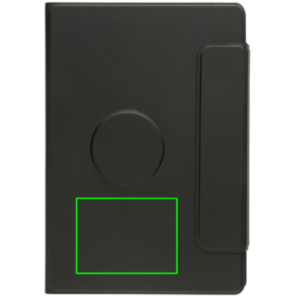A5 portfell, taaskasutatud polüester PU magnetsulguriga ja magnetiline telefonihoidik, mis ühildub iPhone 12 või uuemate versioonidega, A5 jooneline märkmik, FSC® sertifikaadiga ja 64 lehte/128 lehekülge; kreemjas paberivärv; paberi kaal 80 gsm, dokumenditasku ja 2 visiitkaarditaskut. Märkmik on korduvtäidetav.