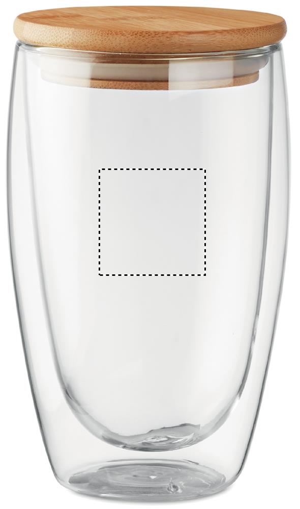 Kaksiseinäinen 450 ml borosilikaattilasi bambukannella, kannessa silikonirengas. Luonnollisen materiaalin (bambu) vuoksi, tuotteiden värissä/ koossa saattaa olla erinäisyyksiä ja tämä voi vaikuttaa painatuksen lopputulokseen.