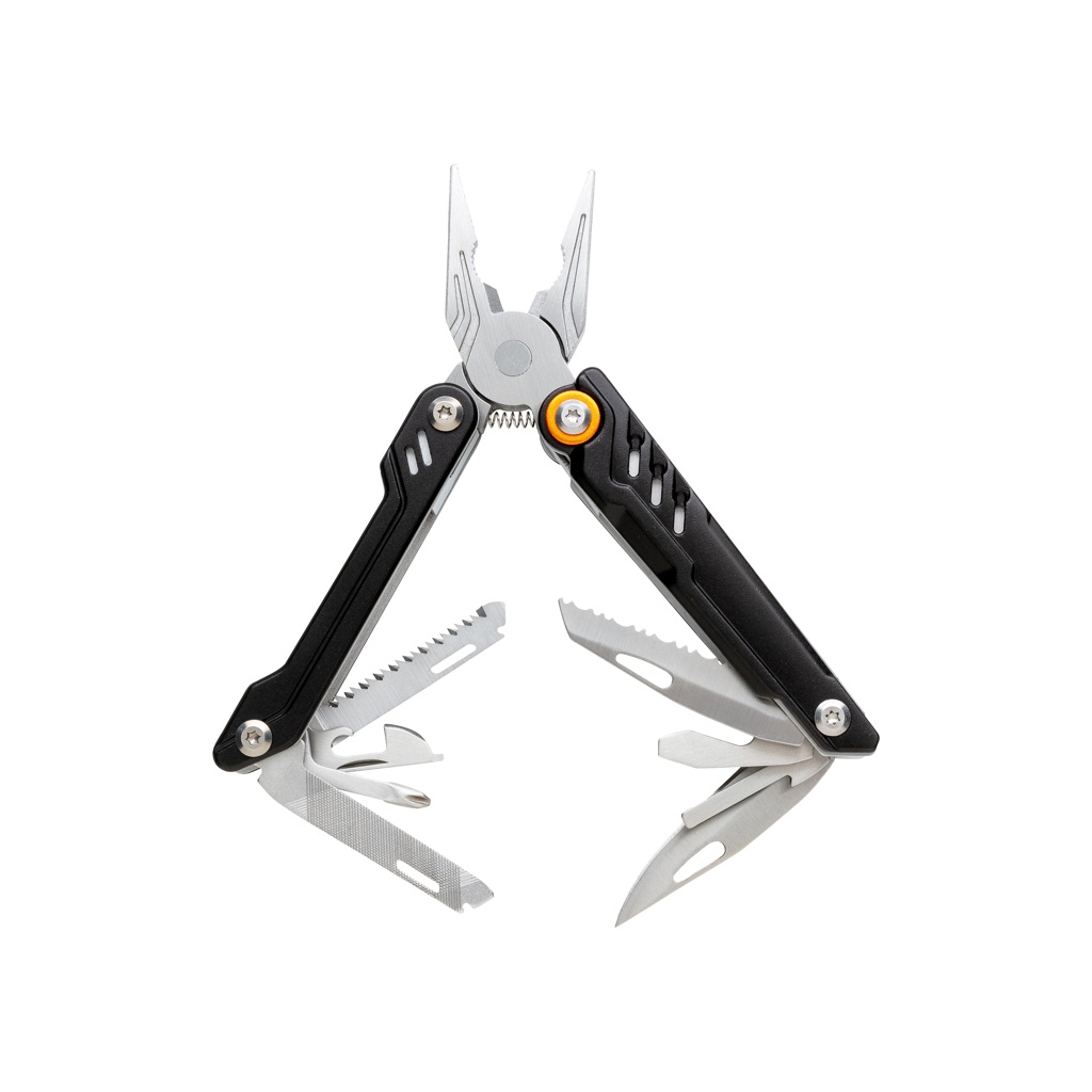 Huippukestävä työkalu, jossa 13 toimintoa. Pakattu ylelliseen lahjapakkaukseen, ml. huippulaatuinen 1680D-pussi. Alumiinirunko ja ruostumattomat terästyökalut. Työkaluihin kuuluvat: pitkät nokkapihdit, standardipihdit, katkaisupihdit, sahalaitaterä, pullonavaaja, suuri talttapäämeisseli, keksikokoinen talttapäämeisseli, veitsi, viila, ristipäämeisseli, tölkinavaaja, pieni talttapäämeisseli, saha.