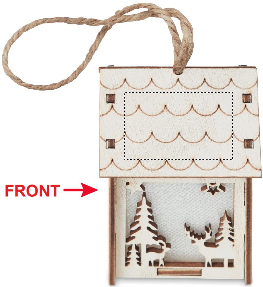 MDF valmistettu joulukoriste talo, sisällä valo ja talon katossa ripustuskoukku. 3 AG12 patteria sisältyy toimitukseen.