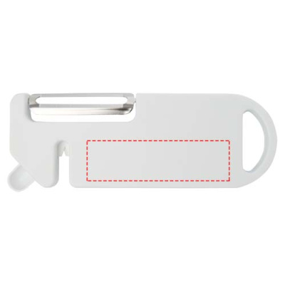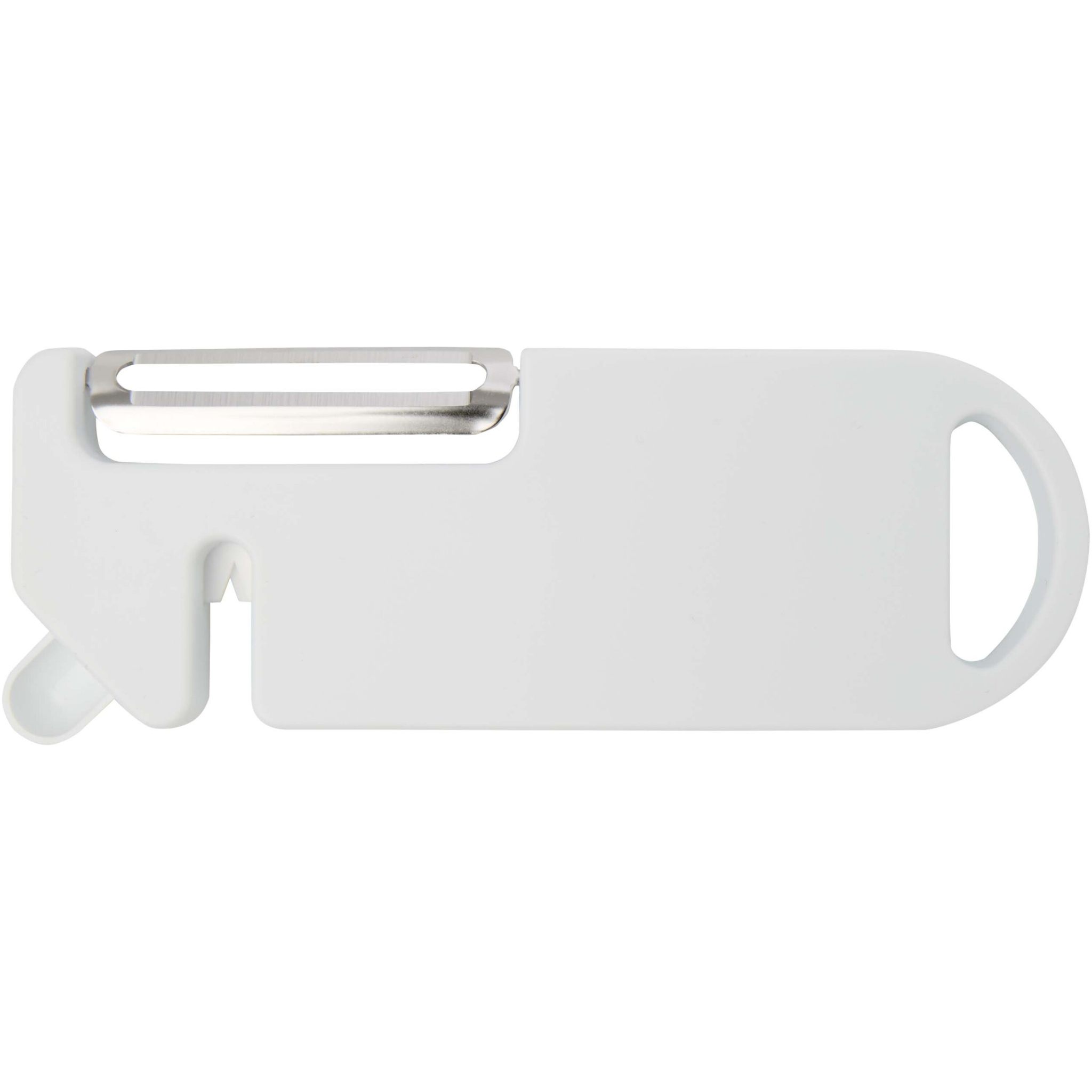 Tässä monikäyttöisessä keittiövälineessä yhdistyy neljä keskeistä toimintoa yhdessä kompaktissa muotoilussa. Kierrätetystä muovista valmistetussa työkalussa on kuorimaveitsi, pullonavaaja, veitsenteroitin ja terävä kärki perunan rupien poistamiseen. Erillinen ripustusreikä mahdollistaa helpon säilytyksen. Käytännöllinen, tilaa säästävä, monipuolinen ja välttämätön jokaiselle kotikokille.