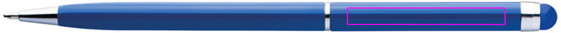 Ruostumattomasta teräksestä valmistettu kuulakärkikynä, jossa on sinikirjoitus muovitäyttö ja värisovitettu kosketustoiminto pidikkeen yläpuolella. Kaiverramme logosi klipsien alle.