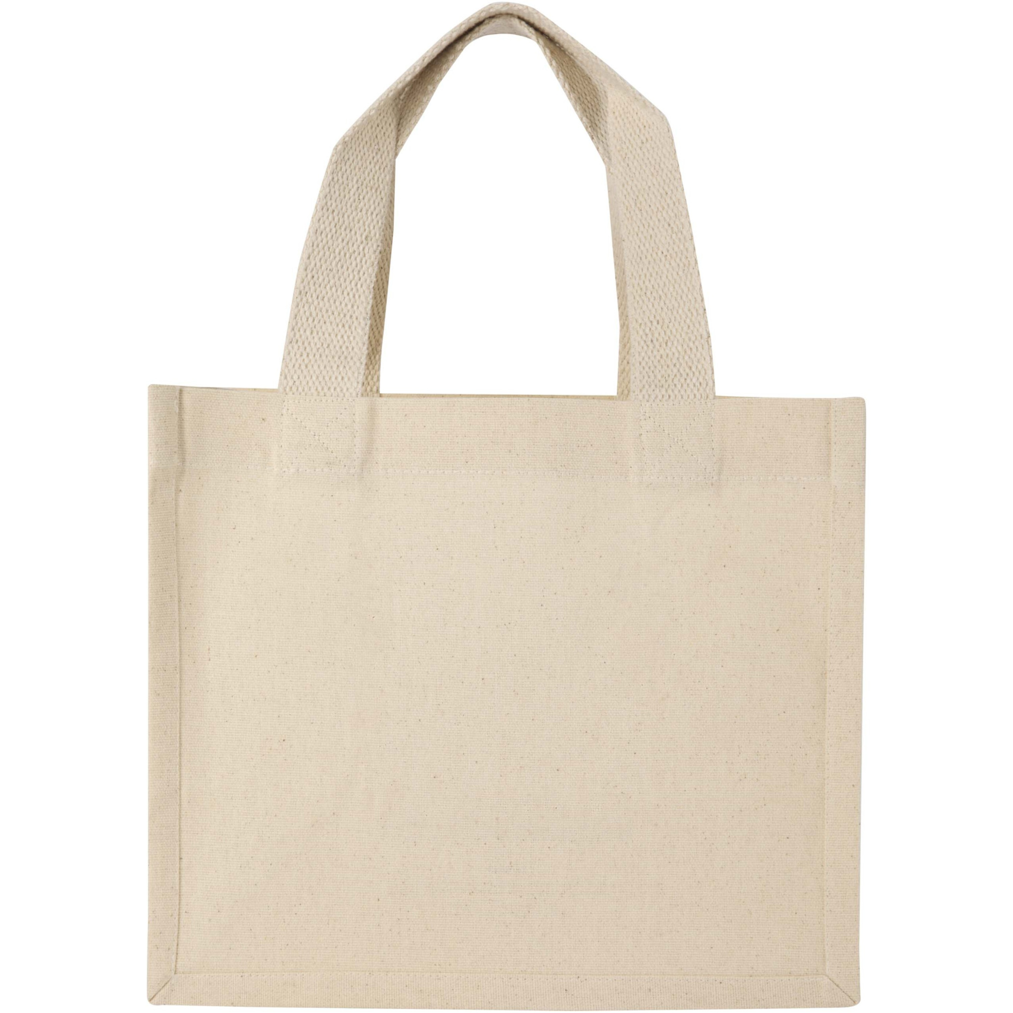 100-prosenttisesti GRS-kierrätetystä 220 g/m²:n puuvillasta valmistettu Odessa-minikangaskassi vahvikkeilla on suunniteltu niin, että sitä on miellyttävä kantaa 35 cm pitkien kahvojen ja suuren tilan ansiosta. Tämä kompakti kassi on täydellinen valinta tabletin, kirjan tai muutaman välttämättömyysesineen säilyttämiseen, päivittäisten asioiden hoitoon tai rentoihin illanviettoihin. Siihen sopivat painatusmenetelmät ovat myös GRS-sertifioituja, millä varmistetaan, että koko toimitusketju on läpinäkyvä ja sertifioitu. Valmistettu Intiassa.