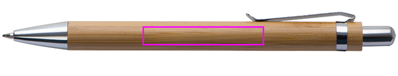 Bambusta valmistettu kuulakärkikynä, jossa sininen kirjoitus suuri täyttö. Viimeistely tehdään laserkaiverruksella klipsien alle.