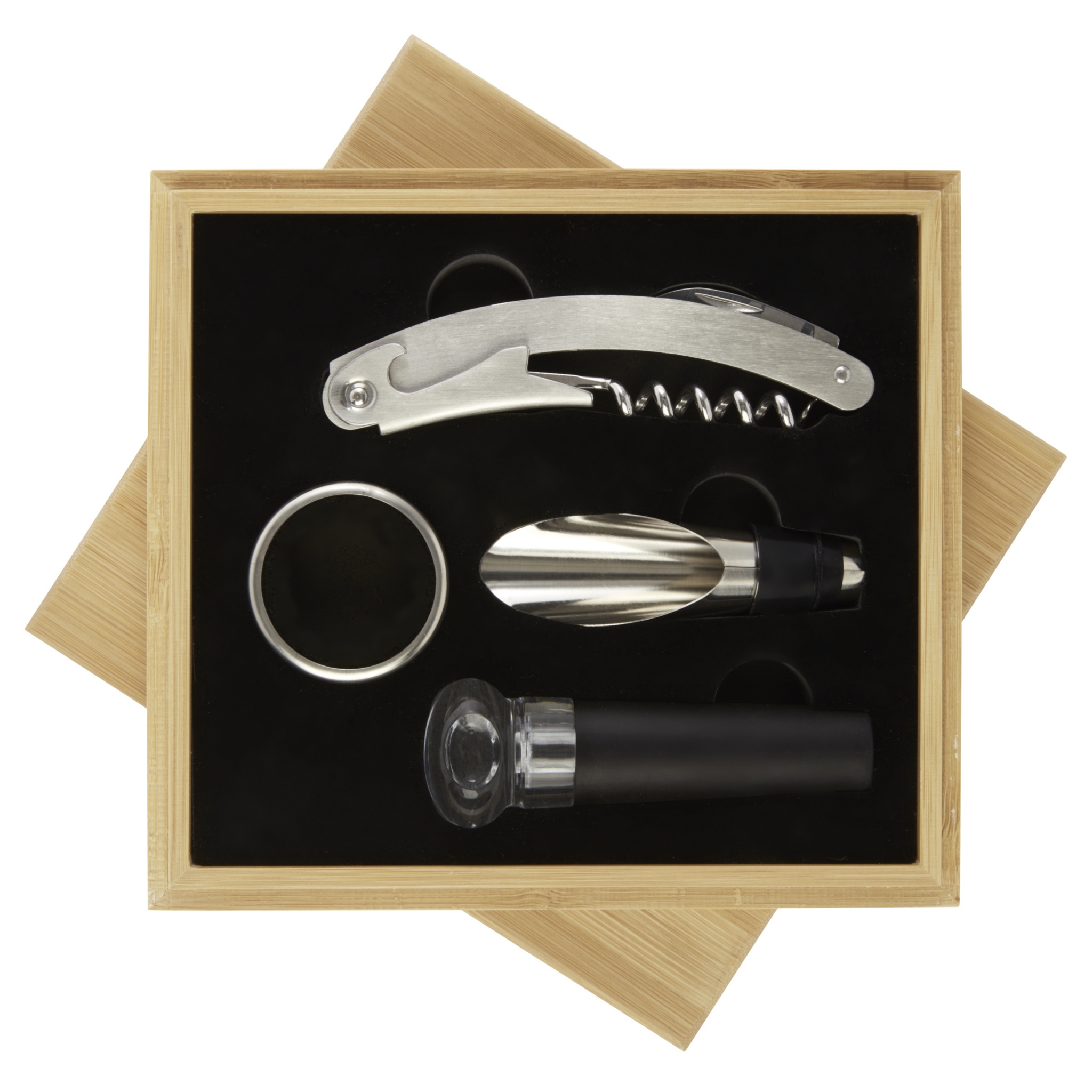 4-osainen viinisetti, johon kuuluu tarjoilijan korkkiruuvi, stopperi, kaadin ja rengas. Toimitetaan bambusta valmistetussa lahjapakkauksessa, joka on hankittu ja valmistettu kestävien standardien mukaisesti.