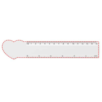 Sydämenmuotoinen kiinteä kierrätysmuoviviivain, jossa merkinnät tuumina tai senttimetreinä.