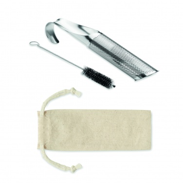 Uudelleenkäytettävä ruostumattomasta teräksestä valmistettu teesiivilä setti puuvillapussissa, sisältää puhdistusharjan.
