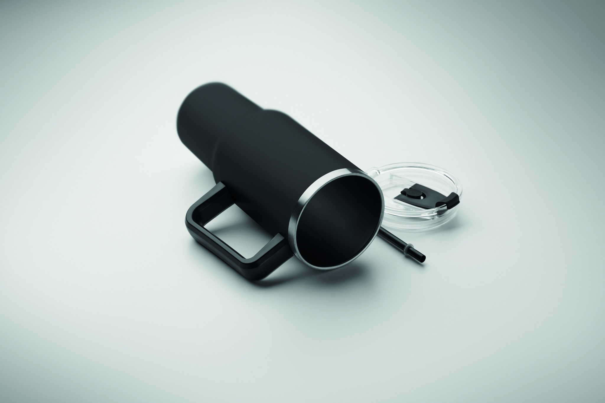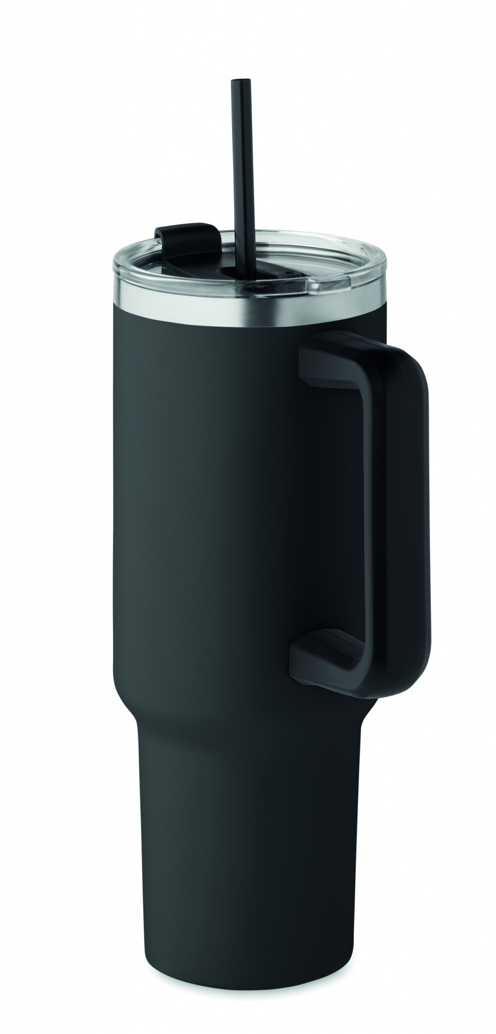 Kierrätetystä ruostumattomasta teräksestä valmistettu kaksiseinäinen muki, jonka kannessa PE-pilli. Tilavuus 1200 ml. (90 % kierrätettyä ruostumatonta ja 10 % ruostumatonta terästä).