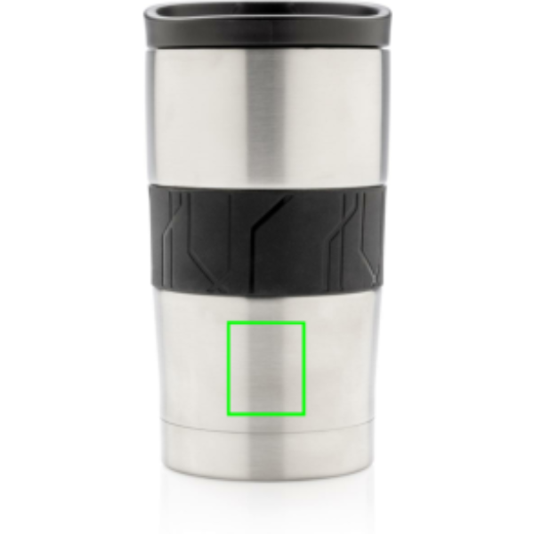 Tiivis, tyhjiöeristetty muki on valmistettu kaksiseinäisestä, ruostumattomasta teräksestä, ja siinä on silikonikahva ja liukukansi. Voidaan pestä astianpesukoneessa ja sopii useimpiin kahviautomaatteihin. Sisältö: 300 ml.