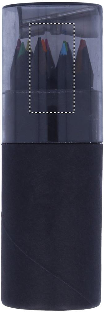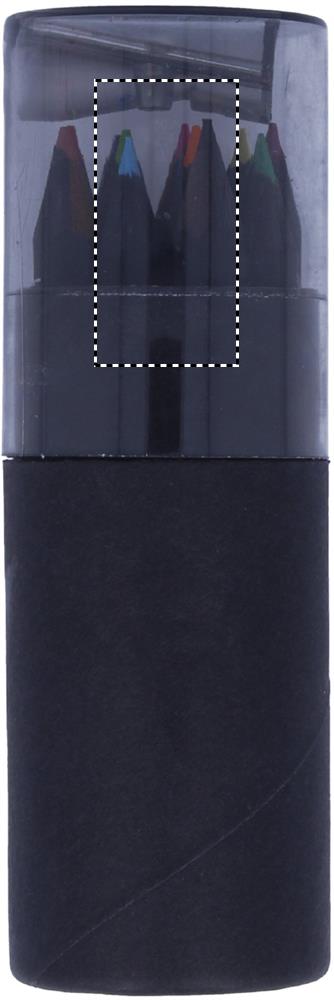 Musta kartonkipakkaus sisältää 12 värikynää ja kynien teroittimen pakkauksen kannessa.