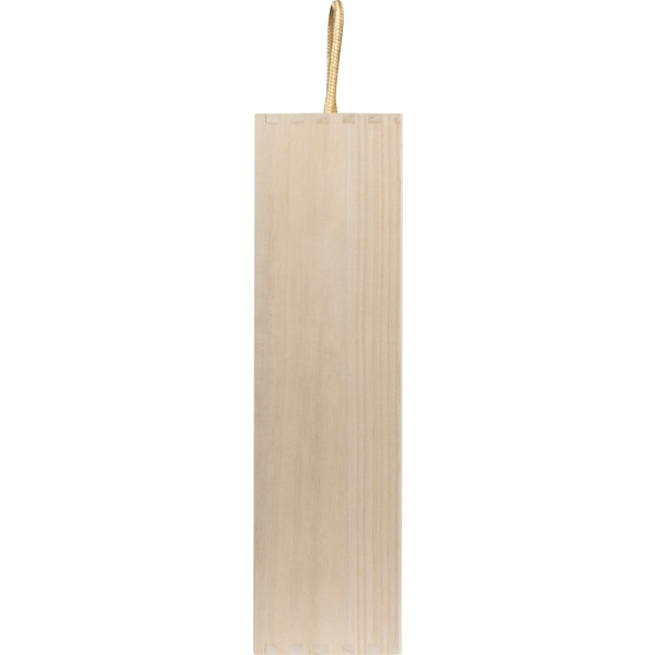 Vaaleasta puusta valmistettu viinilaatikko integroidulla kantonauhalla ja liukuvalla kannella. Kiinnitettävä puinen kisko pitää pullon tukevasti laatikossa. Kaivertamme logosi ulkopuolelle.