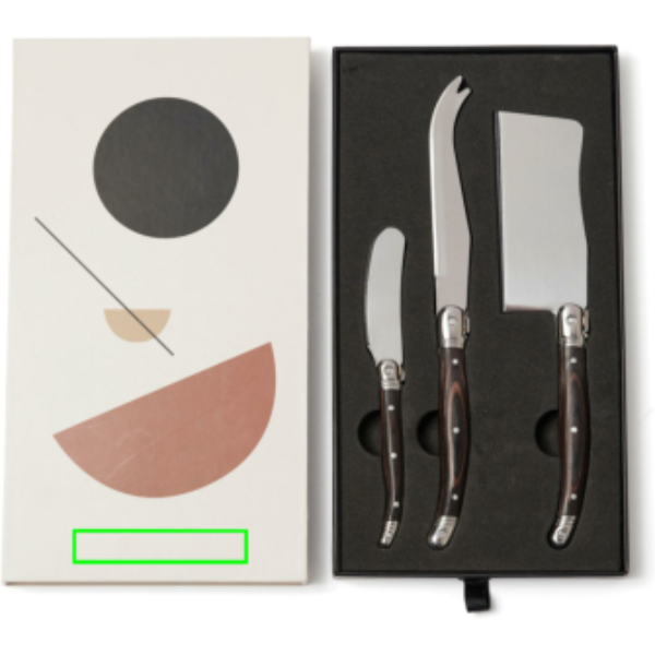 Ylellinen tarjoilusetti, jossa voiveitsi ja kaksi käytännöllistä ja tyylikästä veistä erilaisille juustoille ja muille herkuille. Terät ovat ruostumatonta terästä ja kahvat Pakkawoodia. Konepestävä.