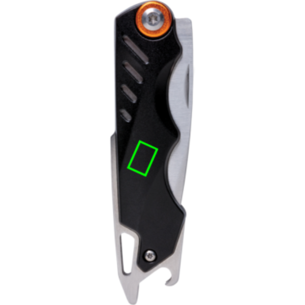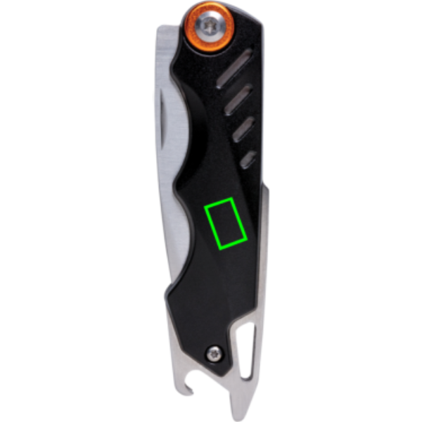 Itin stiprus peilis su 4 funkcijomis. Supakuota prabangioje dovanų dėžutėje su aukštos kokybės 1680D maišeliu. Korpusas iš aliuminio ir nerūdijančio plieno įrankiai. Įrankiai: sulankstomas peiliukas, įdėklo užraktas, diržo segtukas, butelių atidarytuvas.