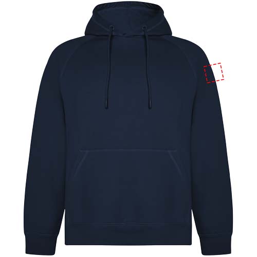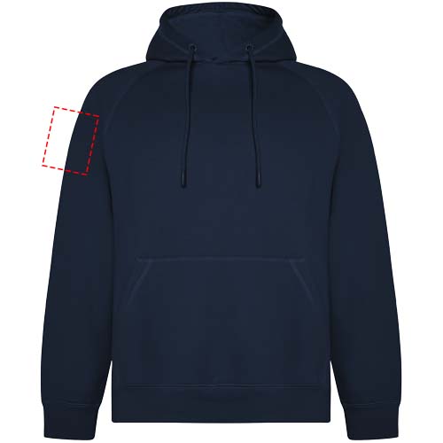 Unisex gobtuvas iš ekologiškos medvilnės ir perdirbto poliesterio. Kengūros stiliaus kišenė. Viengubas džersio pamušalas gobtuvu. Apvali reguliuojama virvelė ir išsiuvinėtos kilpelės. Rankogaliai ir juosmuo iš 2x1 rumbuoto audinio. Nuimama etiketė. Individuali perdirbta pakuotė. Vyriškas modelis yra 185 cm ir dėvi L dydį, o moteriškas modelis yra 168 cm ir dėvi S dydį.