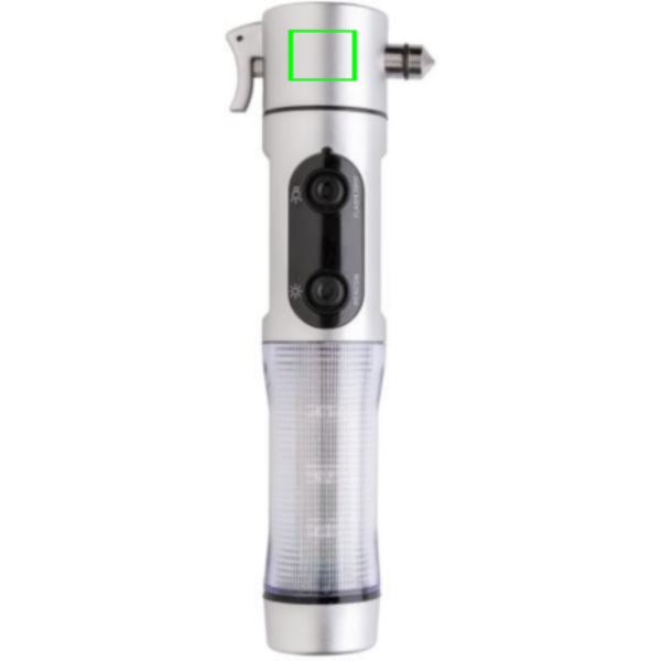 Аварийный фонарь, корпус из серебристого АБС-пластика, 1 белый светодиод и 9 красных проблесковых маячков сбоку, резак, стеклобой и магнитное основание для установки на крыше автомобиля.
