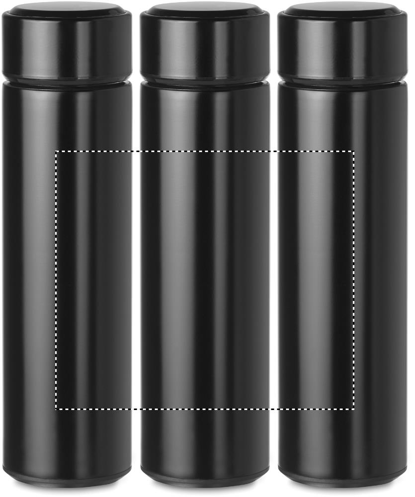 Бутылка вакуумная двустенчатая из нержавеющей стали. Имеет встроенный сенсорный светодиодный термометр на крышке и внутри чайное ситечко. Батарейка тип CR2032 в комплекте. Не протекает.Объем 450 мл. Не протекает.