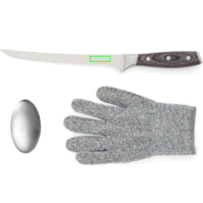 Набор для разделки рыбы, включающий нож для разделки, перчатку из стальной сетки и металлическое мыло. Перчатка обеспечивает дополнительный захват рыбы, защищая вас от любых неприятностей. Металлическое мыло удаляет запахи, такие как запах рыбы и лука, которые другим мылам трудно удалить. Нож изготовлен из немецкой стали X50CrMoV15 с рукояткой Pakkawood. Удобная рукоятка и превосходный баланс лезвия делают нож удобным и простым в работе. Размер: лезвие 21 см.