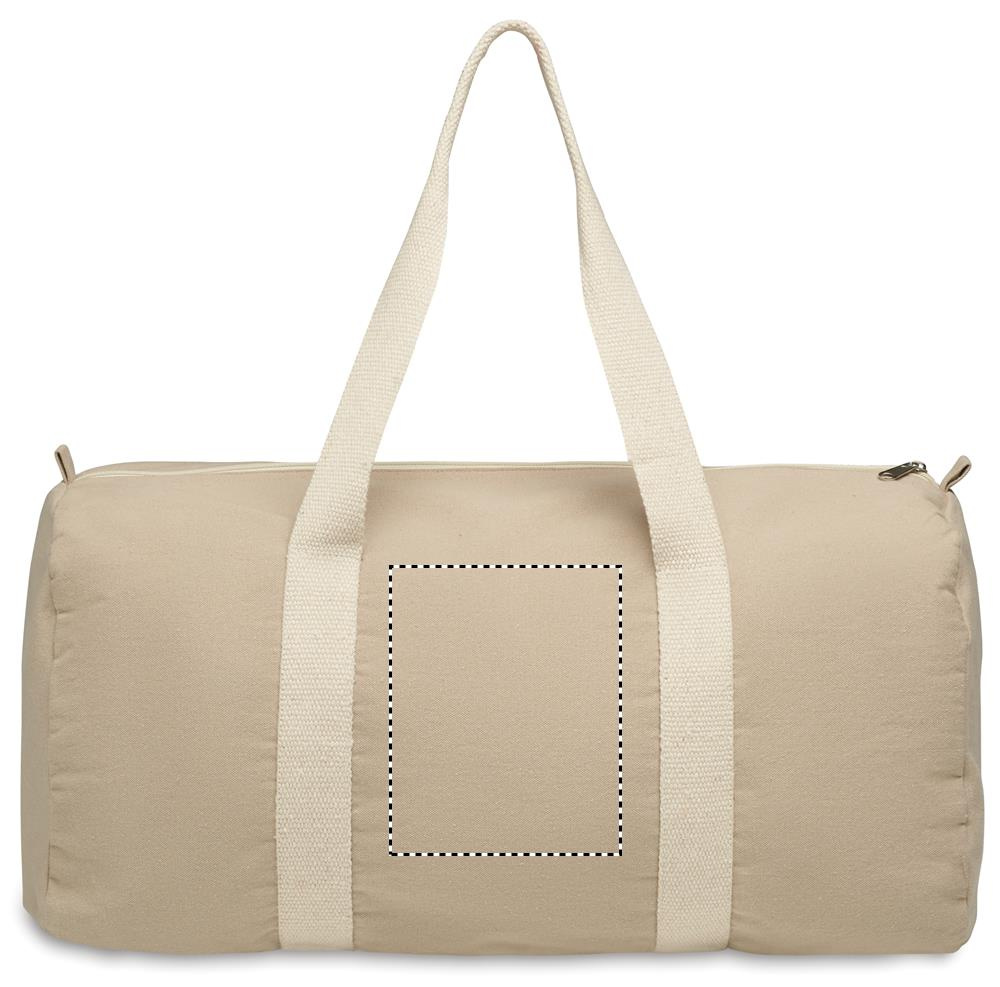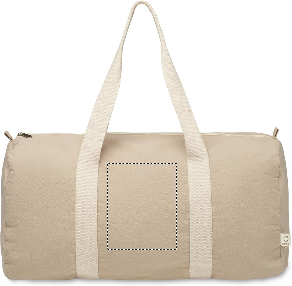 Duffle, sports or travel bag with zippered side compartment and zippered inner pocket in 320 gr/m² recycled cotton (80%) and recycled polyester (20%) with long handles.