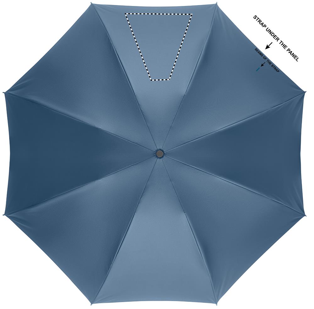 Зонт реверсивный 23-дюймовый из эпонжа RPET 190T. Автомат. Спицы из стекловолокна. Бамбуковая ручка с хлопковым ремешком на запястье. Футляр так же RPET.
