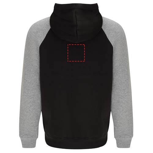 Tvåfärgad unisexhuvtröja. Huva med korsad hals och metallöglor. Kontrasterande innerhuva, dragsko och raglanärmar. Känguruficka. Muddar och fåll i ribbstickad 1 x 1 elastan. Avtagbar etikett.