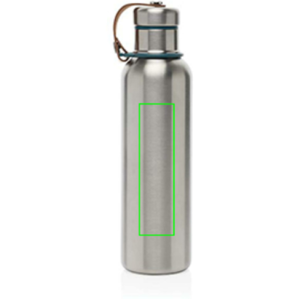 Stainless Steel Insulated Water Bottle är en elegant vakuumförseglad flaska som håller drycker kalla i 24 timmar eller varma i 12 timmar. Locket är också helt i rostfritt stål, vilket innebär att vattnet inte kommer i kontakt med någon plast. Konstlädret fungerar som en bärögla och är en fin designdetalj. Endast handtvätt