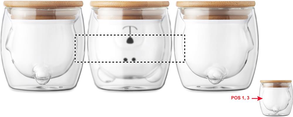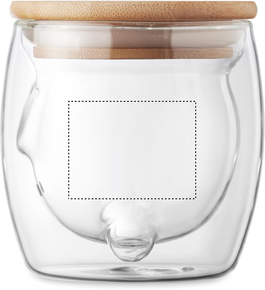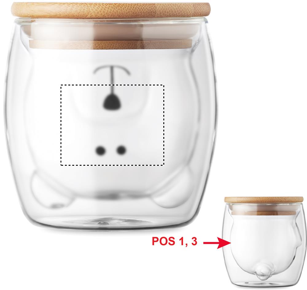 Dubbelväggig borosilikatmugg med björnmönster och bambulock. Kapacitet: 260 ml.