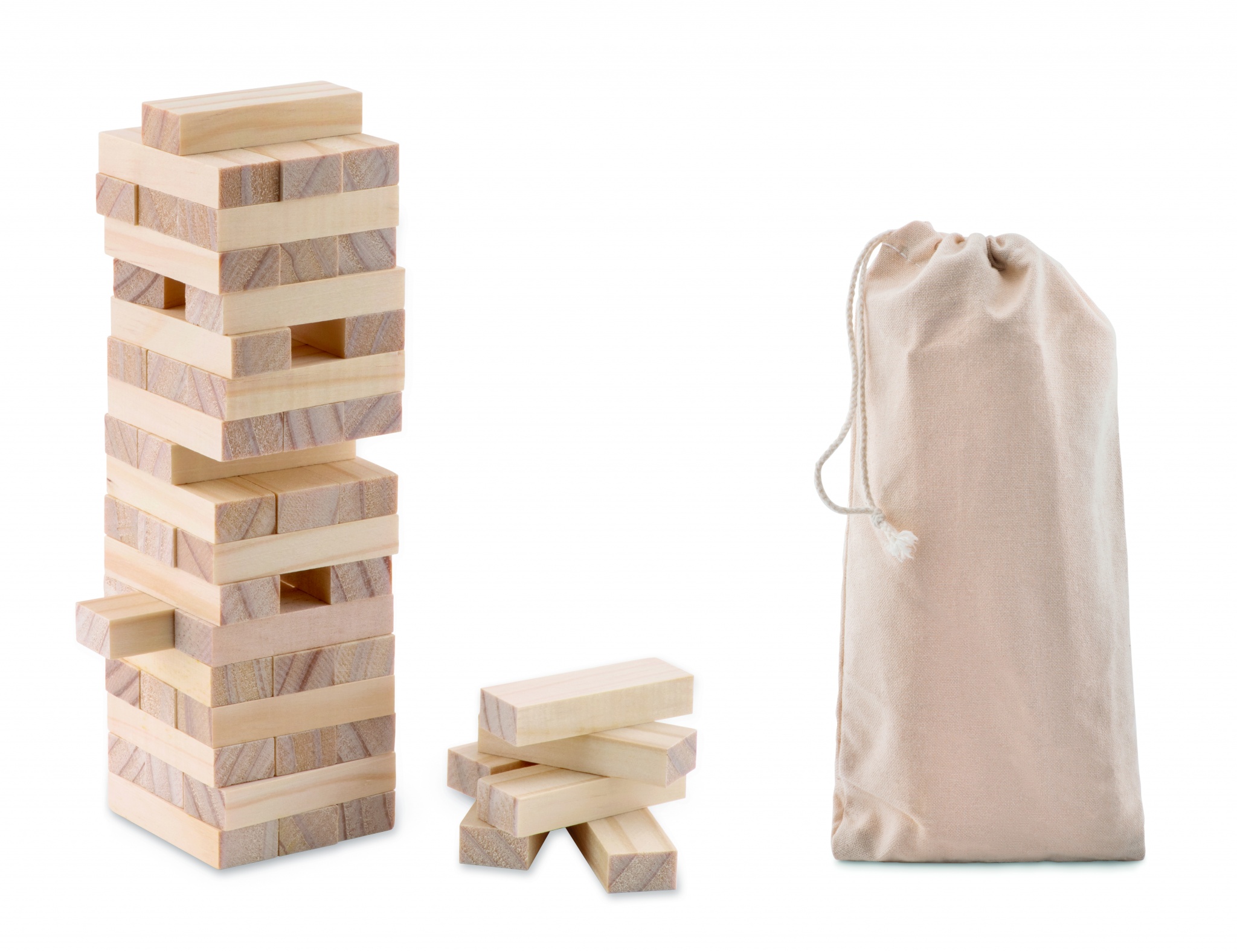 Jenga spel i trä, 54 st block i en bomulls påse.