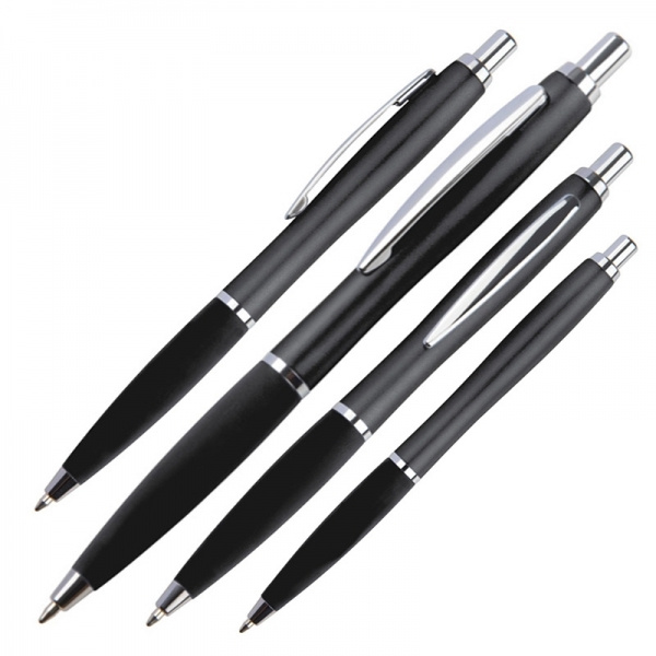 Smal plastkulpenna med blåskrivande plastpåfyllning och gummerad greppzon. Din logotyp kommer att tryckas under klippet.