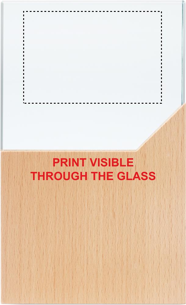 Pris- eller minnesplakett i kristall på en bas av bokträ i en presentförpackning.