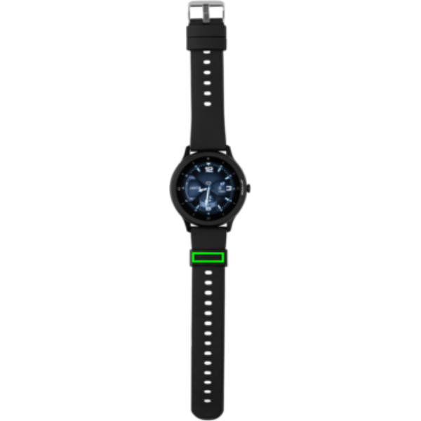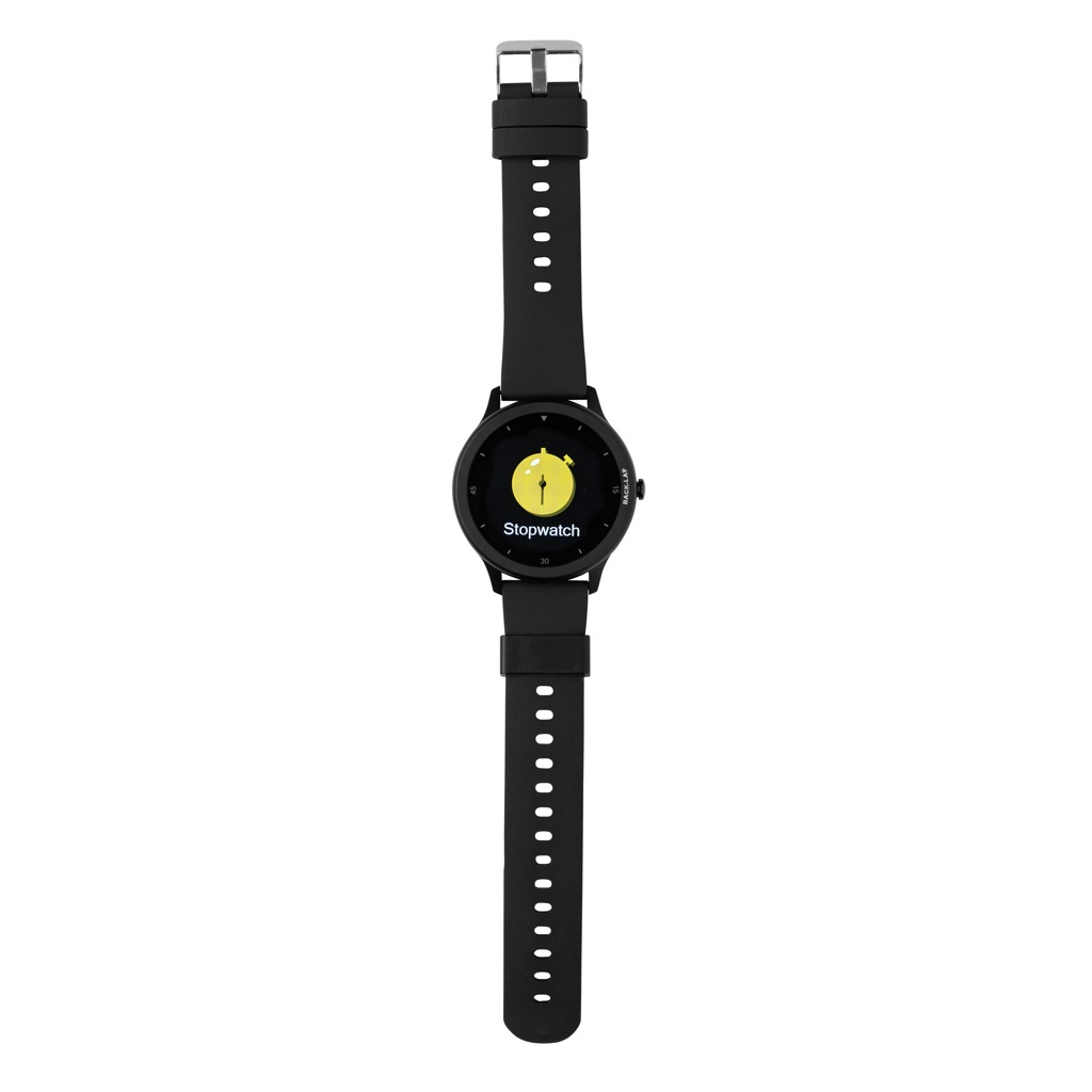 Modern livsstilsklocka med 1.28” rund touchskärm, snabb respons, som registrerar alla dina aktiviteter. Display med hög resolution. Tillverkad av RCS (Recycled Claim Standard) certifierad återvunnen TPE armband och ram i zinklegering. Totalt återvunnet innehåll: 23% baserat på total produktvikt. RCS certifiering säkerställer en helt certifierad leveranskedja av de återvunna materialen. Inkluderade funktioner: Stegräknare, kaloriräkning, distans, multi-sport (24), alarm, pulsmätare, blodtrycksmätare, sömnregistrering, kalenderuppdateringar, meddelanden: SMS, Facebook, Skype, WhatsApp, Twitter etc. Kompatibel med Android 4.4 och IOS 8.0 och upp. BT 5.0. Standby-tid 25 dagar och en arbetstid på upp till 7 dagar. IPX 68 vatten- och dammtät. Clipladdare för att ladda upp klockan medföljer. Levereras i FSC® mix kraft förpackning. Produkt och accessoarer är 100% PVC-fria.